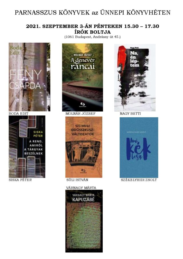 PARNASSZUS KÖNYVEK az ÜNNEPI KÖNYVHÉTEN 2021. SZEPTEMBER 3-ÁN PÉNTEKEN 15.30 – 17.30 ÍRÓK BOLTJA (1061 Budapest, Andrássy út 45.)