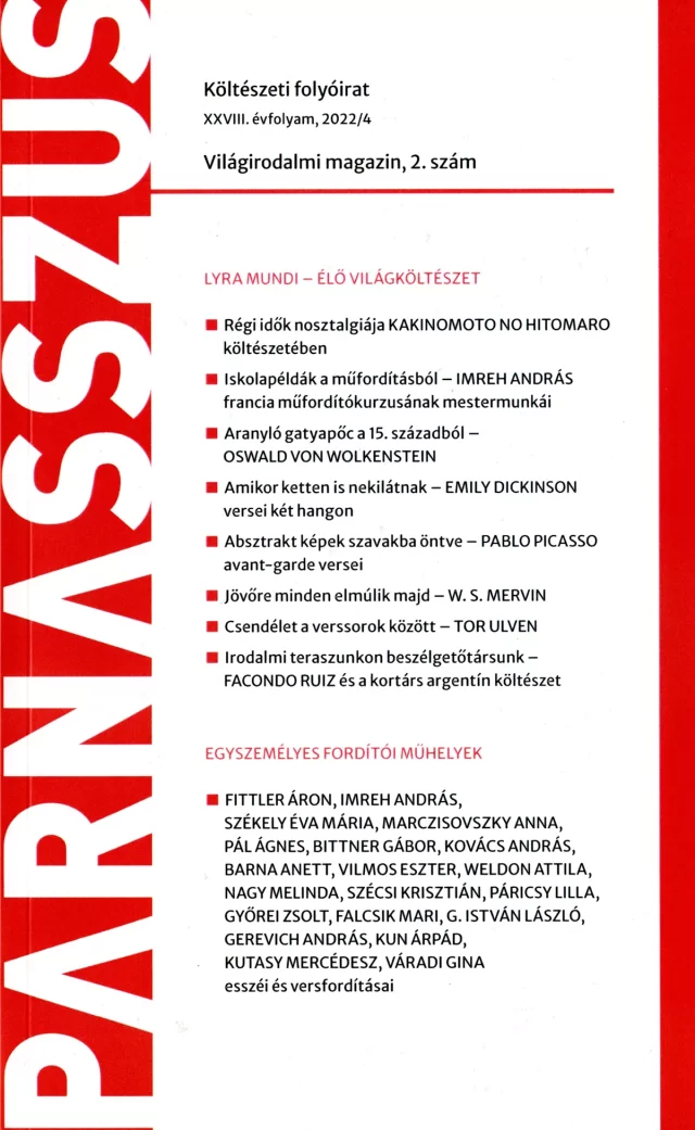 Benne: Lyra Mundi – Élő Világköltészet Kakinomoto no Hititomaro a VII-VIII. századi Japán titokzatos dalnoka Iskolapéldák a műfordításból – Imreh András francia műfordító kurzusának mestermunkái Emily Dickinson versei két hangon Rendelhető az alábbi linken: https://parnasszus.hu/termek/parnasszus-2022-4-szam/