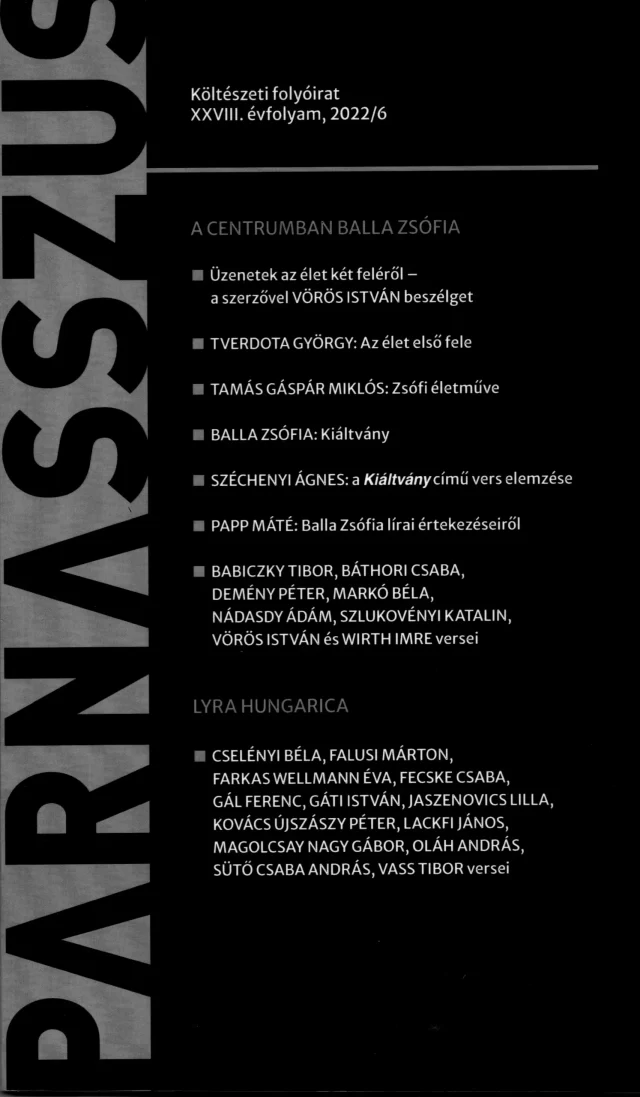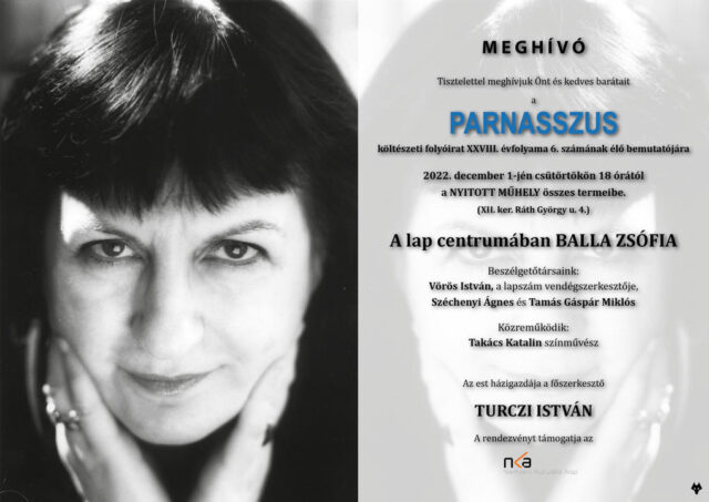 December 1-én jelenik meg a Parnasszus idei 6. száma. A lap centrumában Balla Zsófia. Lapszámbemutató 2022. december 1-én 18 órai kezdettel a Nyitott Műhelyben. Beszélgetőtársak Széchenyi Ágnes és Tamás Gáspár Miklós. Verseket Takács Katalin olvas. A házigazda Turczi István. A vers legyen veletek!