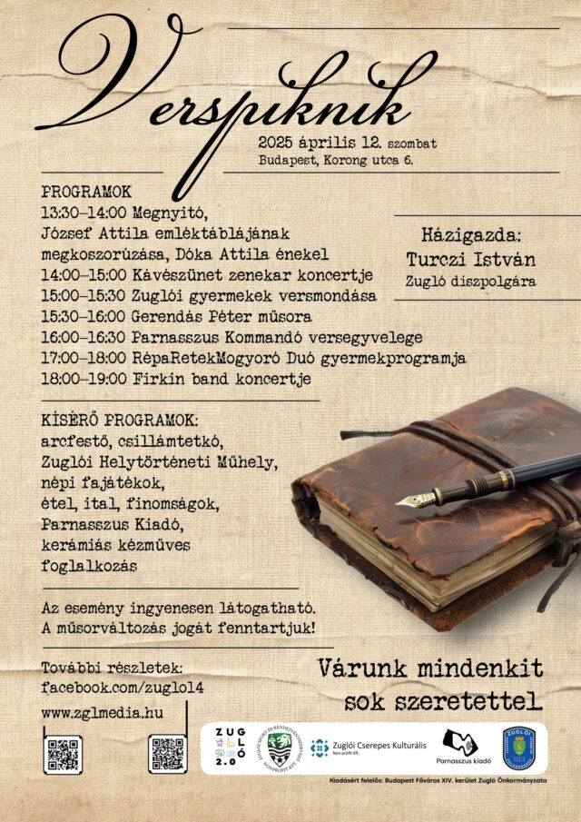 Április 12-én, szombaton egész délután irodalommal és zenével várjuk Zuglóban, a Korong utcában – József Attila születésnapja alkalmából. PROGRAM: 13:30 – 14:00 Megnyitó & József Attila emléktábla koszorúzása 14:00 – 15:00 Mohikán zenekar – Bódi László Cipő emlékkoncert 15:00 – 15:30 Zuglói gyermekek versmondása 15:30 – 16:00 Gerendás Péter műsora 16:00 – 16:30 Parnasszus Kommandó…