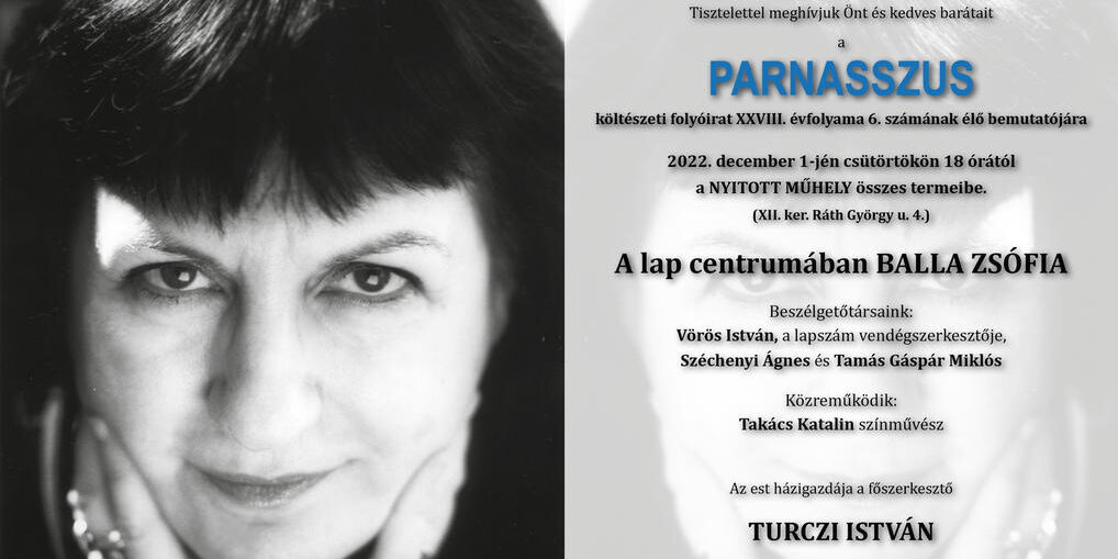 December 1-én jelenik meg a Parnasszus idei 6. száma. A lap centrumában Balla Zsófia.
